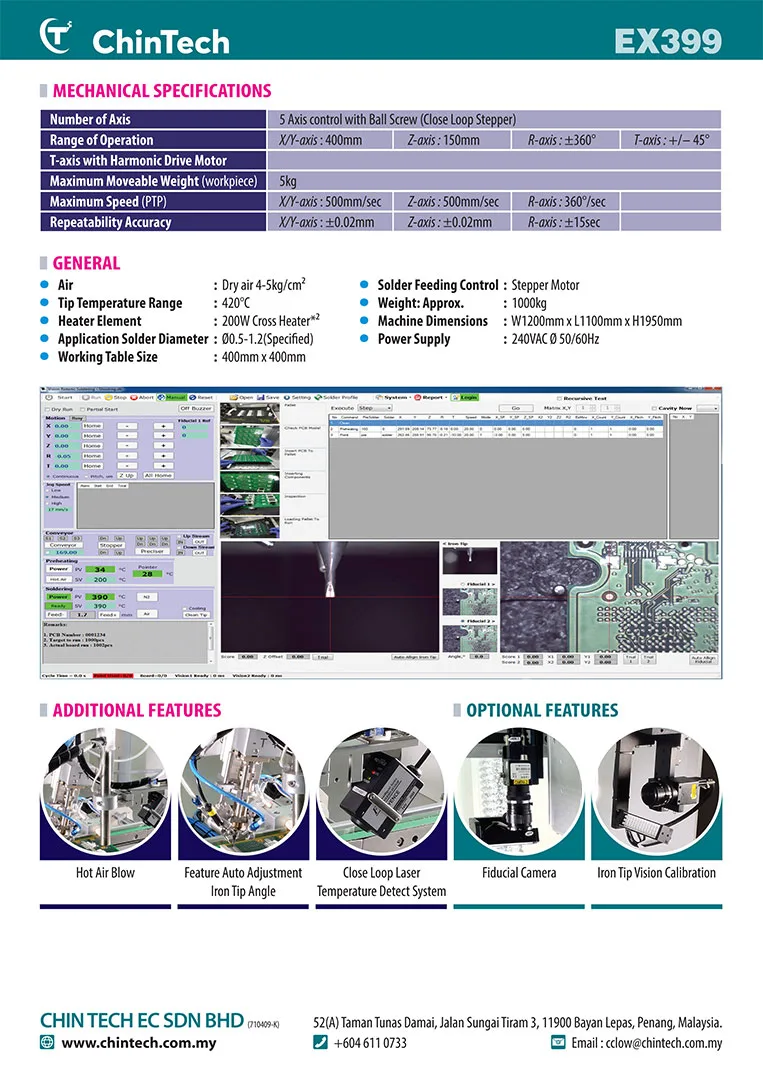 Chin Tech provides professional installation, programming, and maintenance for the EX399 robotic soldering machine across Malaysia. Our team ensures smooth operation and reliable performance, helping your facility maximize efficiency and ROI.