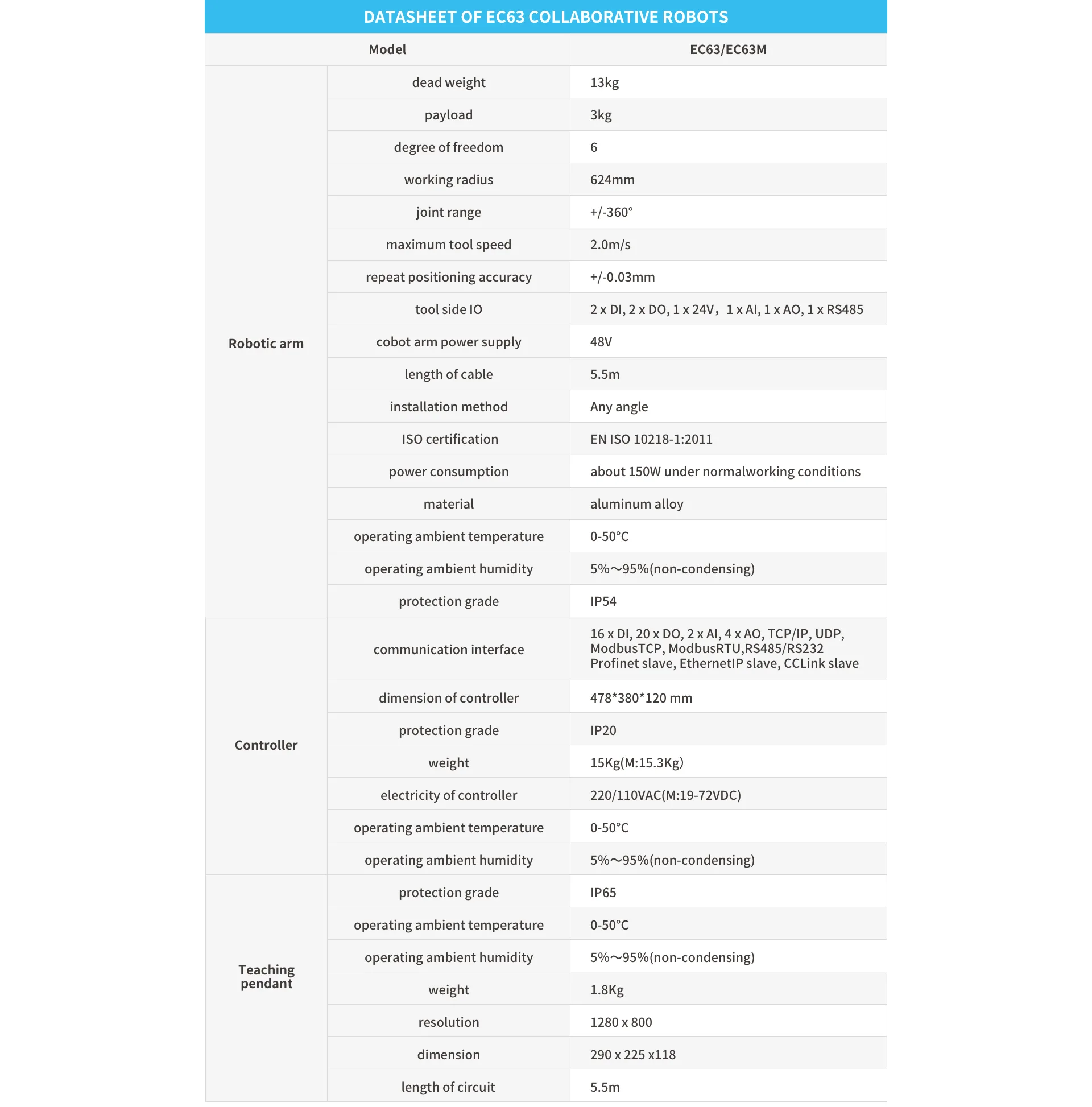Lightweight: The lightest and most flexible collaborative robot with a lighter self-weight and a stronger payload. The self-weight is only 13kg and the payload is 3kg.